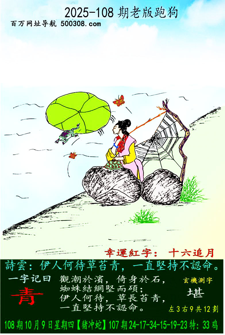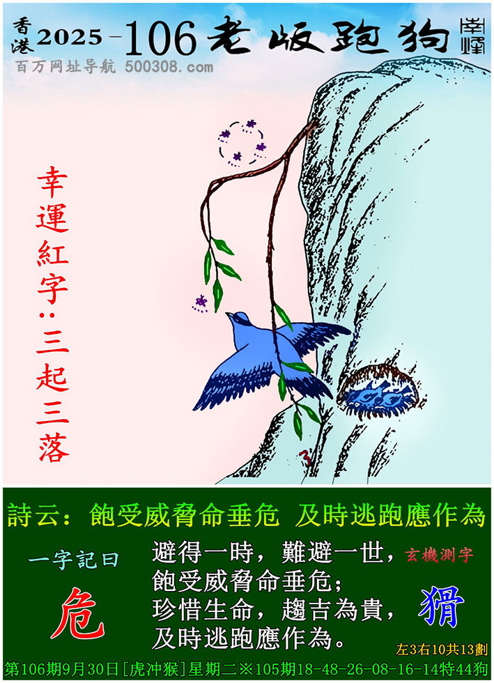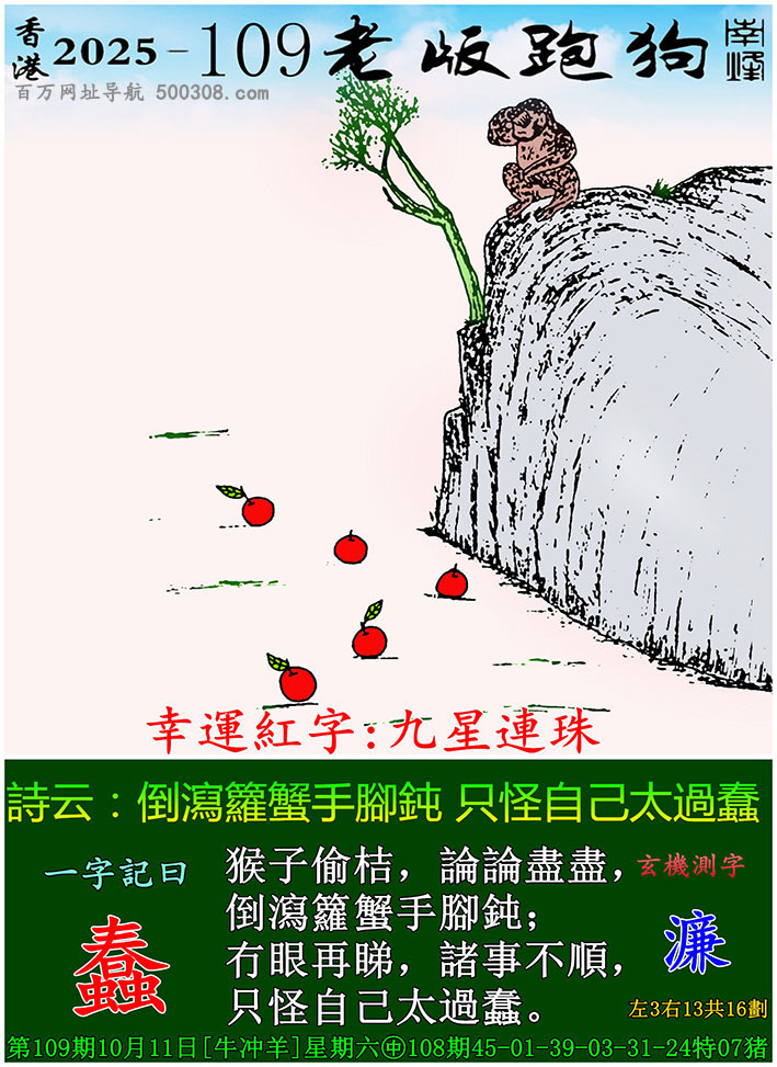 109期跑狗图:一字記之曰:【裂】 裂縫藏身,餐風飲塵。 嫩枝斜出,探頭食取。玄機測字:《踐》 一語中特:三番四次