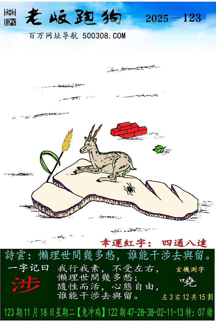 131期跑狗图:一字記之曰:【井】 井圈環疊,物各有適。 雙筐承殼,牛羊自安。玄機測字:《洲》 一語中特:四方八面