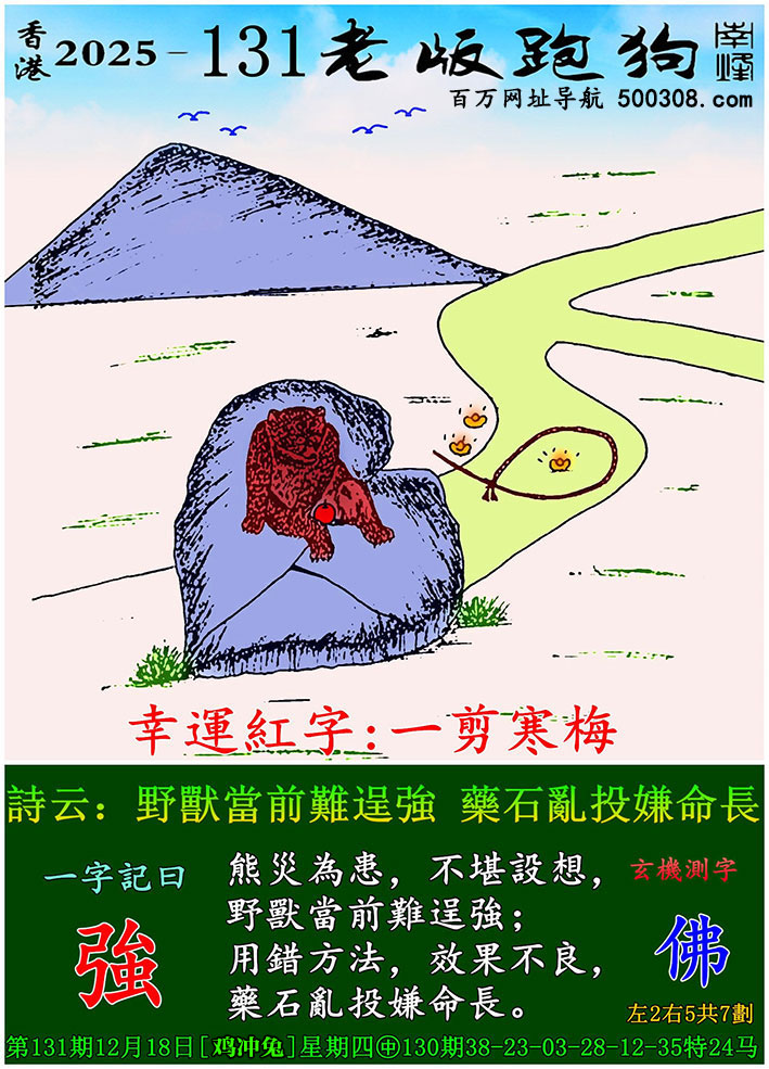 001期跑狗图:一字記之曰:【避】 斑影藏鋒,伏椿待風。 伏身草際,避其鋒芒。玄機測字:《朝》 一語中特:三心兩意