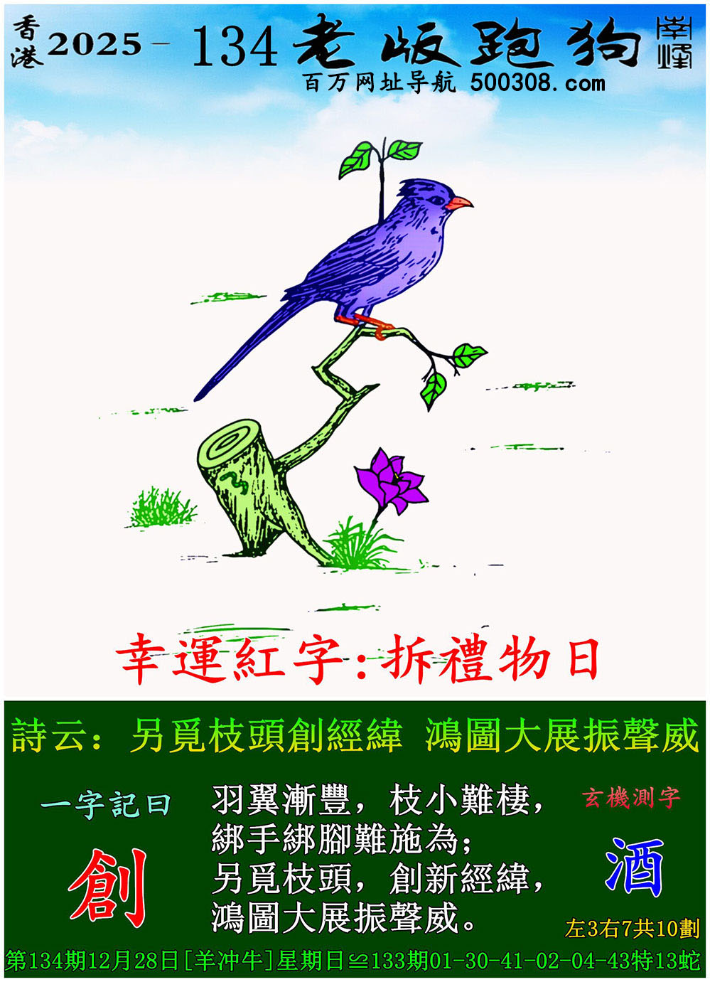 134期跑狗图:一字記之曰:【哺】 逢下蔭涼,母側雛藏。 啄蟲哺飼,咕咕輕喚。玄機測字:《純》 一語中特:九死一生